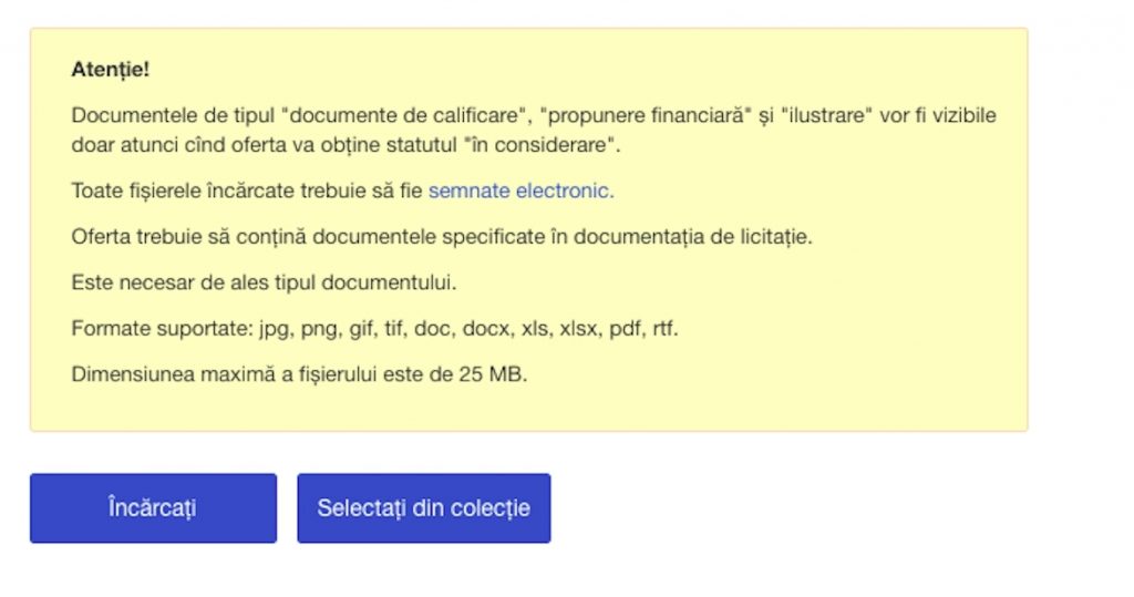 Atenție: Pentru a asigura depunerea ofertei cu succes, recomandăm efectuarea acestei acțiuni preventiv, cu minim o oră până la închiderea perioadei de depunere a ofertei. Încărcarea preventivă a ofertei asigură timp pentru rezolvarea unor probleme tehnice în cazul apariției acestora și oferă timp destul pentru sincronizarea și stocarea informației (expedierea documentelor) în baza centrală de date SIA RSAP MTender.