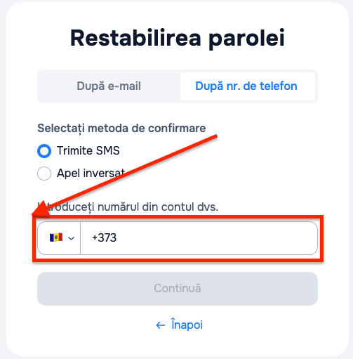 În cîmpul următor, introduceți numărul de telefon fără cifra ”0” (zero) și apăsați continuă.