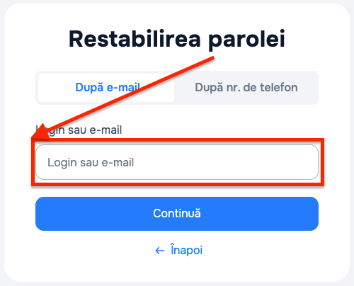 În cazul recuperării prin adresa de email, introduceți login-ul Dvs. sau adresa poștei electronice în cîmpul menționat și tastați ”Continuă”.
