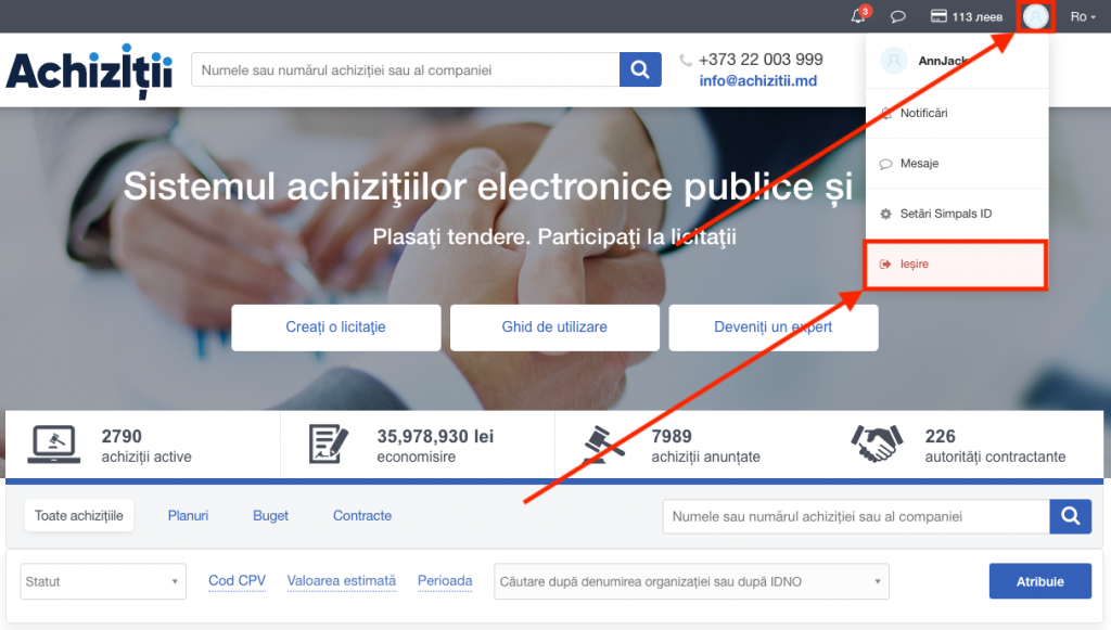 Pentru a recupera parola e necesar să faceți delogare, pentru aceasta faceți click pe ”Profilul utilizatorului” și apăsați ”Ieșire”.