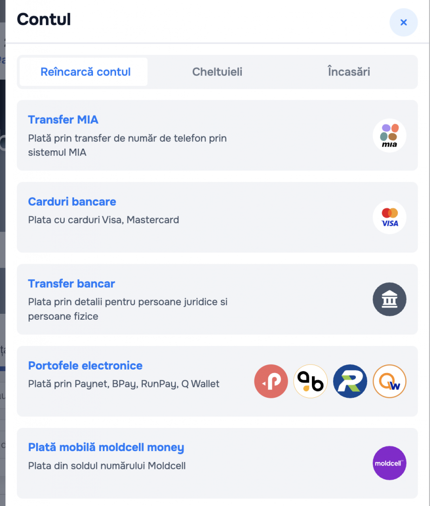 Pentru a suplini contul, trebuie să alegeți metoda cea mai convenabilă din lista de mai jos.